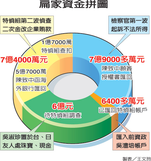 昨天庭讯中,审判长蔡守训特意询问特侦组,目前起诉的不法所得是否不包括“7亿4000万元”,检察官也清楚表示“不包括”;而在庭讯中,陈致中的律师叶大慧也提到,扁家放在银行保险室的钱,搬运前“可能有10余亿元”,显示还有数亿元待追查。