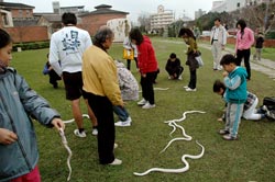 7日下午有人在台湾新竹县某公园的草地上遛白蛇,吸引不少人好奇驻足围观。(图片来源:台湾《中国时报》)