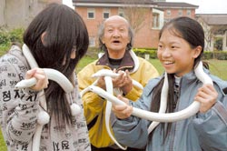 爱蛇成痴的李哲能(中)遛白蛇,两名胆子比较大的小女生,将白蛇套在脖子上抚摸,甚至将白蛇当作武器互相示威,三人最后都忍不住哈哈大笑。(图片来源:台湾《中国时报》)
