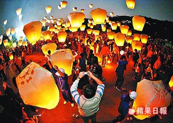 祈愿靠天灯。昨晚超过6万民众涌入台北县平溪乡放天灯,看着天灯冉冉升空,众人不时发出惊叹声。昨晚共施放12波2600个天灯,多数民众心愿都是期待赚钱或身体健康。来源:台湾《苹果日报》