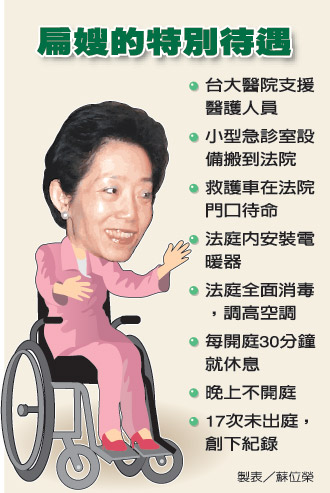 2007/03/16 吴淑珍第9次请假,台大医院内科主任翁昭旼作证:“吴淑珍的突发性低血压情况,严重的话可能猝死。”