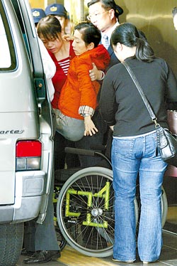 吴淑珍10日下午抵达台北地方法院时,看护将她抱下车坐上轮椅进入法院。来源:台湾《中国时报》