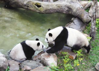团团、圆圆昨天上午首次在户外展示区亮相,兴奋地在水池边玩水,它们活泼好动的模样,让游客直呼“好可爱”。来源:台湾《联合报》