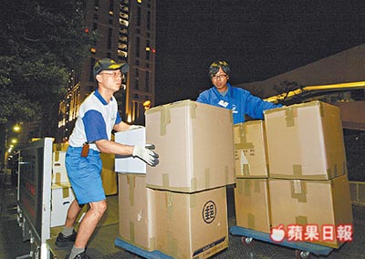 昨夜在陈水扁台北宝徕花园广场住家附近,搬家工人将一箱箱货品搬上车,分析应是陈致中搬家。来源:台湾《苹果日报》