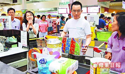 陈水扁之子陈致中(右二)在结帐时,黄睿靓双手抱拳拜托媒体不要把他们购买的物品全部拍出来。来源:台湾《苹果日报》