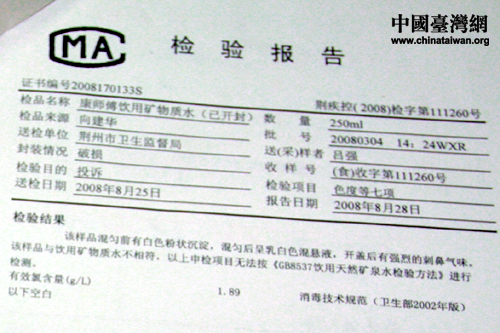 当初又为何在送检报告上签字呢?辛伟鹏解释说,通过外观判断,包装同公司产品是一样的,但瓶中的水又非常可疑,其实一直处在疑惑中,但为了配合荆州市卫生监督局的工作,尽快送检,没过多考虑,就签了字。“送检报告上品名栏的填写是应该更客观一些,比如‘疑似康师傅饮用矿物质水’”。