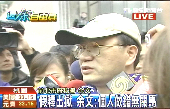 中国台湾网4月6日消息 据台湾TVBS报道,前台北市政府秘书余文,6日上午10时步出监狱。余文在马英九特别费案中,因为伪造文书被判处有期徒刑1年,从去年的6月13日服刑,已经过了9个多月,因为在狱中表现良好声请假释,台湾法务主管部门日前核准。