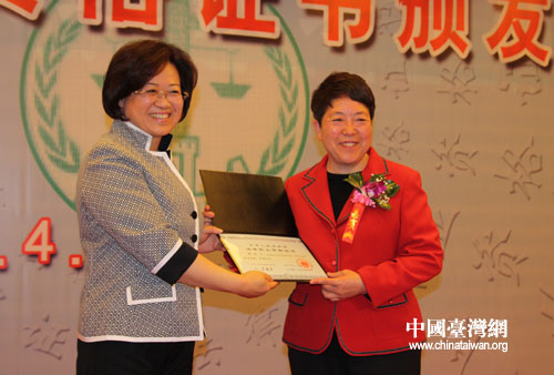国家司法考试司司长丁露为获得律师职业资格的台湾居民颁发资格证书。(中国台湾网 张弛 摄)