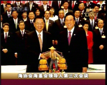 中国台湾网4月26日南京消息 在成功签署《海峡两岸空运补充协议》、《海峡两岸空运补充协议》、《海峡两岸金融合作协议》、《海峡两岸共同打击犯罪及司法互助协议》等协议后,陈云林与江丙坤互赠纪念品。