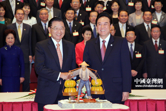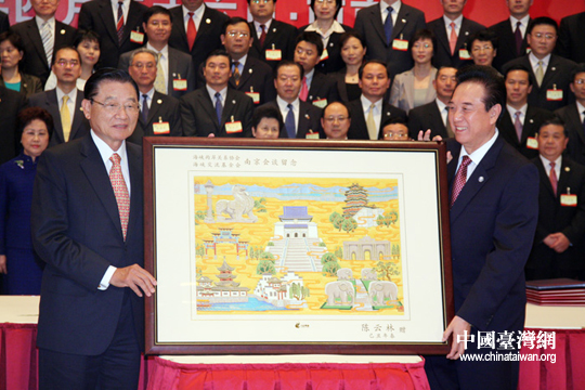 陈云林向江丙坤赠送一幅云锦。26日下午,在成功签署《海峡两岸空运补充协议》、《海峡两岸金融合作协议》、《海峡两岸共同打击犯罪及司法互助协议》等三项协议后,陈云林与江丙坤互赠纪念品。(中国台湾网 钟宝华 摄)