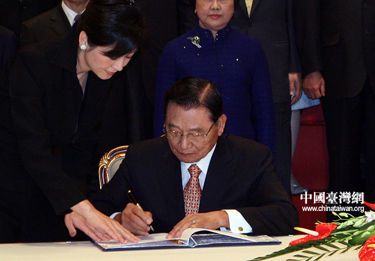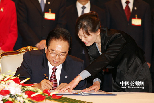 海协会会长陈云林签署协议。26日下午三时许,海协会会长陈云林与台湾海基会董事长江丙坤在南京紫金山庄正式签署《海峡两岸空运补充协议》、《海峡两岸金融合作协议》、《海峡两岸共同打击犯罪及司法互助协议》。(中国台湾网 钟宝华 摄)