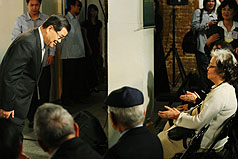 萧万长(左)在致词前,向柏杨的妻子张香华(右)鞠躬致意。