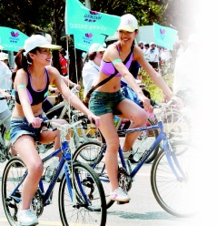 2009年“台湾自行车日”活动昨天上午举行,车友们花尽心思呈现出最独特的造型,包括穿着清凉的辣妹兵团。图片来源:台湾《联合晚报》