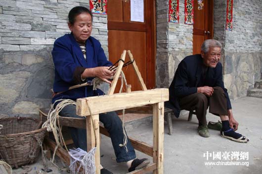 “吉娜”羌寨里的老夫妻,震前种地为生,现在搬进新居,手工制作鞋子来卖给游客,老伴还试穿给记者看,(中国台湾网 钟宝华 摄)
