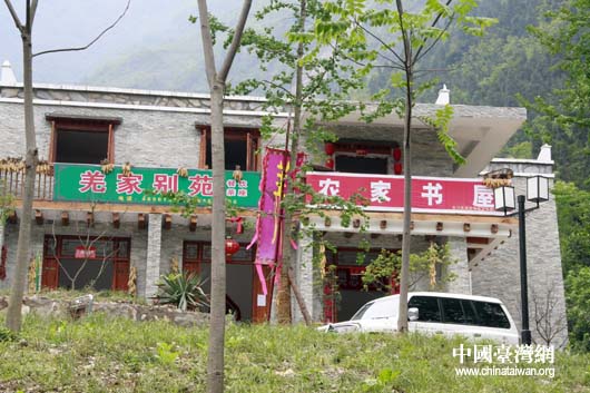 “吉娜”羌寨里的农家做起旅游生意,打出招牌招揽游客。(中国台湾网 钟宝华 摄)