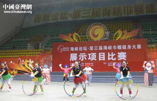 中国台湾网5月19日泉州消息 海峡论坛·第三届海峡巾帼健身比赛展示项目决赛今天晚上7点在泉州侨乡体育馆举行,共有来自台湾、香港、澳门,福建泉州、三明、厦门等7个设区市,以及福建省直机关、福建省个私协等12支队伍参加。比赛中各个代表队的精彩演出,让观众们重新认识了女性的魅力与风采。