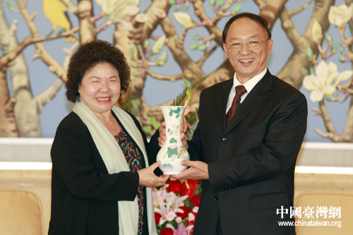 22日下午,中国奥委会主席刘鹏在北京饭店会见了高雄市市长陈菊。图为刘鹏向陈菊赠送精美礼品。(中国台湾网 田云鹏 摄) 第1页第2页第3页第4页
