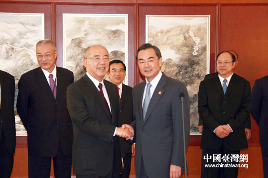 中国国民党主席吴伯雄率领中国国民党大陆访问团于25日11时5分许乘机抵达北京,开始访问大陆行程。中共中央台办主任王毅到机场迎接。(中国台湾网 钟宝华 摄)
