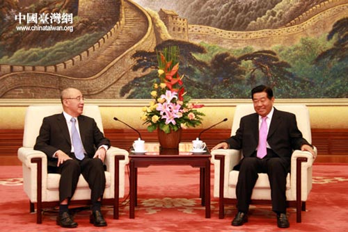 5月25日下午,中共中央政治局常委、全国政协主席贾庆林在北京人民大会堂会见由中国国民党主席吴伯雄率领的中国国民党大陆访问团一行。(中国台湾网 钟宝华 摄)
