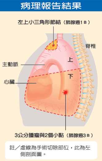 萧万长病例报告示意图:萧万长5月20日开刀切除肺肿瘤,病理报告为肺腺癌,两处病灶分属第一期B、第三期B,切除的十九颗淋巴节化验为阴性,显示没有转移,近期可以出院。 (图片来源:台湾《联合报》)