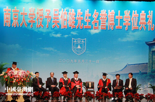 中国台湾网5月31日消息 今天上午9时15分,南京大学授予中国国民党主席吴伯雄法学名誉博士学位典礼在南京大学大礼堂举行。