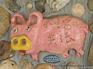吕共法梦想以艺术营造小区让北平村有了大转变,村民联手做了一只粉红猪,将感恩写在猪身上。(图片来源:台湾“今日新闻”)