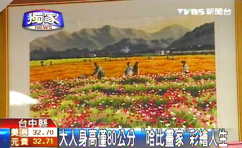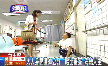 中国台湾网6月10日消息 据台湾TVBS电视台报道,台湾一成年男子如同电影《魔戒》中的“哈比人”一般体型矮小,只拥有10岁小孩的身高。初中毕业,未曾拜师学艺的他,单凭涂鸦的兴趣,在绘画领域找到信心和自我。