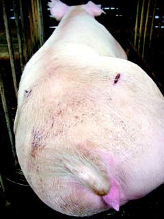 台湾牧场惊传“性侵案”,图中母猪的右边臀部还留着明显刀痕,幸运活下来,其它几头因流血过多死亡。来源:台湾《联合报》