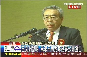 中国台湾网6月19日消息 据台湾TVBS电视台报道,台化今天下午举行股东会,王文洋出任董事确定破局,而台塑集团总裁王文渊也发表声明表示,台塑集团未来不再对外发言王家家务。