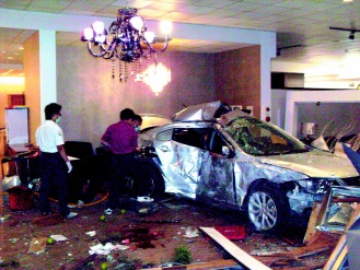 位于兰阳大桥南端的上雅居家具行,前晚11时许还在营业,店员正带客人看家具,突然听到“吱”一声尖锐摩擦声,接着“轰”的一声,整台银色小轿车侧撞进来,迎路整片落地玻璃撞碎,家具被撞飞,霹雳啪啦一片狼藉。