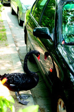 丧夫失子的母黑天鹅,望着车身上自己的影子,以为找到了伴侣,舍不得离去。(图片来源:台湾《联合报》)