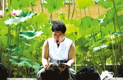 台湾指考第二天,闷热的天气让人昏昏欲睡,一名考生在荷花池边忍不住打起哈欠,但手中仍拿着书不放。图片来源:台湾《中国时报》