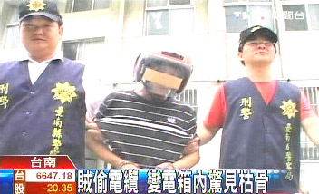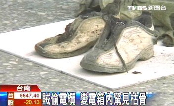 中国台湾网7月3日消息 据台湾TVBS电视台报道,台南县一名小偷潜入歇业的工厂偷电缆,意外发现变电器箱里竟有一具白骨。据台湾警察分析,死者可能是要偷电缆意外触电,死亡时间超过2年;发现白骨的窃贼,也因为留在现场,通缉犯身份曝光,被带回警局。