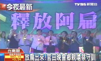 中国台湾网7月10日消息 据台湾TVBS电视台报道,台湾本土社团昨天晚上在台南县官田乡西庄惠安宫前广场举办“释放阿扁”晚会,数百名陈水扁支持者不时高喊口号,最后一起点燃蜡烛,希望陈水扁能在今天获释。