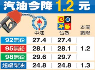 调降后,98无铅汽油跌回30元以下,每升29.6元,95无铅汽油28.1元,92无铅汽油27.4元,超级柴油24.8元;台塑石化的98无铅汽油比中油贵1角、为29.7元,其余价格相同。