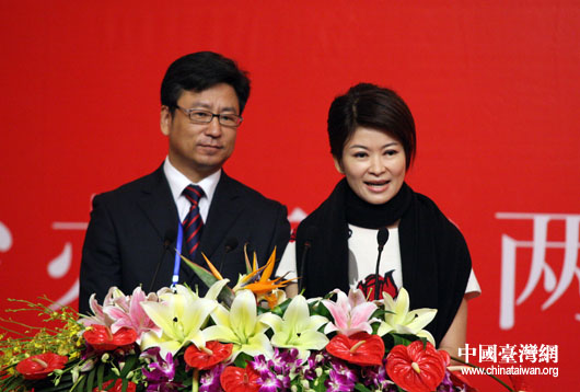 7月11日上午10点20分,第五届两岸经贸文化论坛专题报告准时登场,由中央电视台主持人白岩松和台湾中天电视台主持人卢秀芳联袂主持。(中国台湾网 钟宝华 摄)