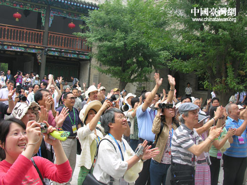 在走进一座明清风格的古建筑后,一座露天雕花戏台呈现在两岸文化界人士面前。这是关中民俗博物院特别为两岸文化界人士安排的原生态“华州老腔”演出,这流传于陕西民间的曲调距今已有1700多年的历史,以其唱腔激昂、铿锵有力著称,被誉为梆子以的鼻祖。来自台湾的文化界人士中多位从事音乐与戏剧工作的艺术家,包括早年曾赴意大利学习西洋歌剧并在国际声乐大赛中获金奖的歌唱家,都被民间艺术家们独特的乐器和质朴、淳厚的唱腔所感染。在台湾研究戏剧卓有成就台湾大学荣誉教授曾永义感慨地说,他们这是在用生命来表演啊。
