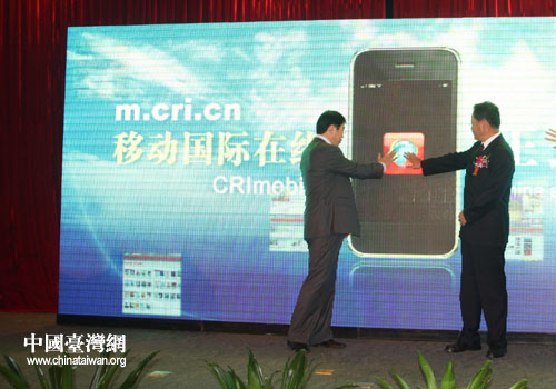 “移动国际在线”今天在北京正式启动,图为国家广电总局副局长田进(左)、国际广播电台台长王庚年按下启动图标。(中国台湾网 张弛 摄)