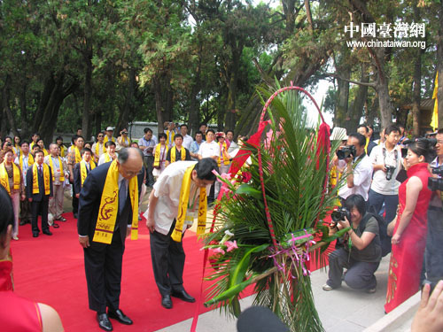 程建人与汪志刚代表两岸文化界人士向黄帝陵敬献花篮。(中国台湾网 芜同 摄)