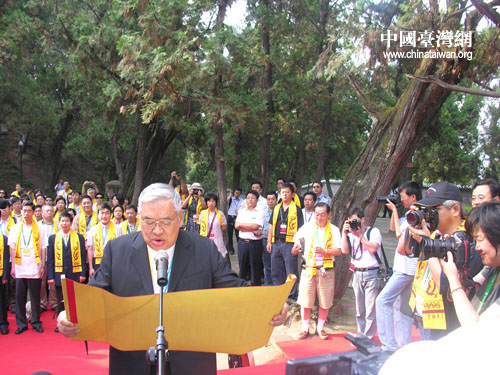 中国台湾网7月19日陕西黄陵县消息 7月19日上午,参加“情系长安——两岸文化联谊行”活动的160余位两岸文化界人士,在黄帝陵恭祭轩辕黄帝。台湾嘉宾团顾问、台湾世新大学教授、中华民俗艺术基金会董事长曾永义恭读祭文。以下为祭文全文。