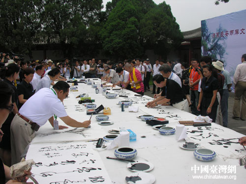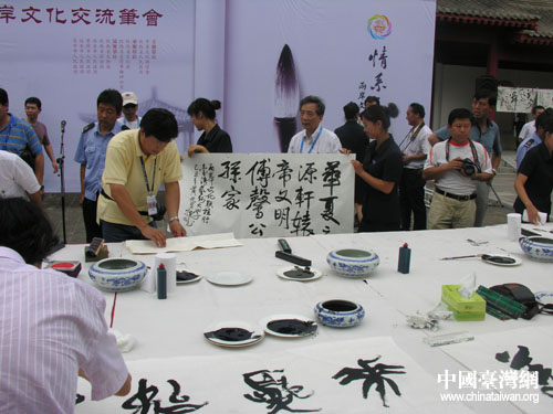 中国台湾网7月20日陕西黄陵县消息 7月19日,参加“情系长安——两岸文化联谊行”活动的96位台湾文化界人士,在黄帝陵恭祭轩辕黄帝,并在祭陵结束后来到轩辕庙古柏院。两岸的书法家代表在千年古柏树下,进行了一场别开生面的文化交流笔会。