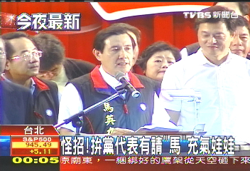 中国台湾网7月21日消息 据台湾TVBS电视台报道,马英九参选国民党主席,20日晚到台北县造势,有许多竞争国民党第18次“全代会”党代表的候选人借机卖力造势,有人打造吉祥物,有人居然拿出男性充气娃娃,脸部画成马英九抢镜头。