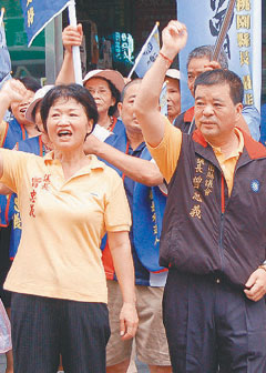 桃园县议长曾忠义昨天率支持者到县党部完成初选登记,众人在门前高呼口号。(图片来源:台湾《联合报》)
