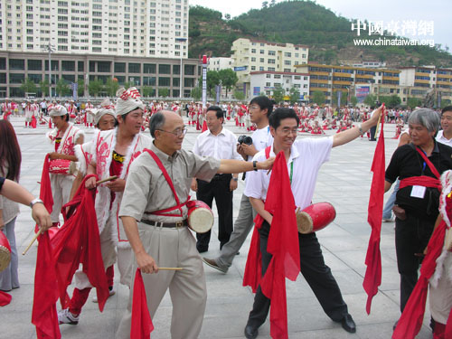 台湾文化界嘉宾团长程建人也上场打起了腰鼓,中华文化联谊会会长助理汪志刚上场助阵。(中国台湾网 芜同 摄)