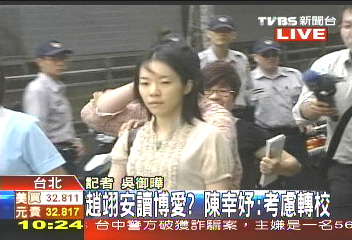 中国台湾网7月23日消息 据台湾TVBS电视台报道,原本计划要南迁高雄的陈水扁女儿陈幸妤,日前低调委托友人帮忙让儿子赵翊安在台北博爱小学办理报到,但因不想让人知道儿子就读的学校,陈幸妤考虑让儿子转校。