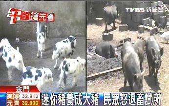 中国台湾网7月23日消息 据台湾TVBS电视台报道,台湾金门一位许姓民众,3年前向金门畜产试验所买了一对“迷你猪”,养了3年后,“迷你猪”却变成100公斤重的大猪,还生了很多大猪,他决定要抗议,把“这些不迷你的迷你猪”,还给金门畜产试验所。