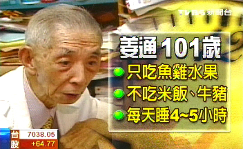 身为岛内最高龄,而且还在看诊的中医师,姜通靠的是自创的另类养生法,他因为挑食,只吃鱼肉、鸡肉和大量水果,米饭,牛肉、猪肉都不吃,每天睡眠4到5小时,喝6大杯牛奶,背脊、腰杆却能挺得跟年轻人一样直。