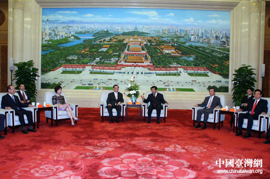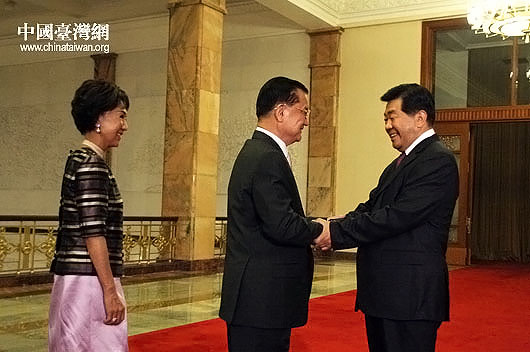7月27日下午,中共中央政治局常委、全国政协主席贾庆林在北京人民大会堂北京厅会见了来访的中国国民党荣誉主席连战一行。(中国台湾网 钟宝华 摄)
