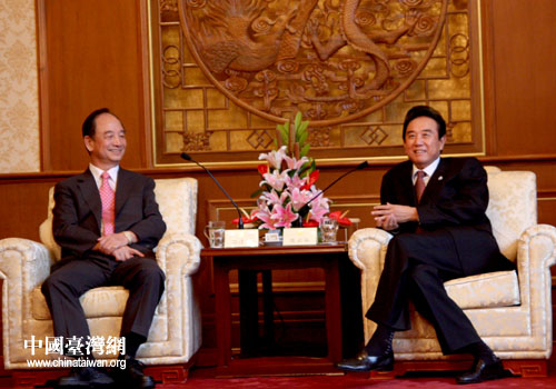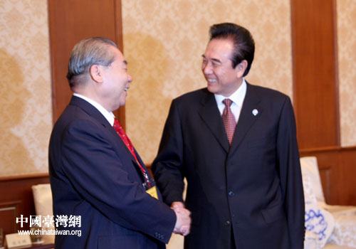 全国政协常委、全国政协港澳台侨委员会主任、海峡两岸关系协会会长陈云林(右)会见台湾各界知名人士访京团。(中国台湾网 张弛 摄)