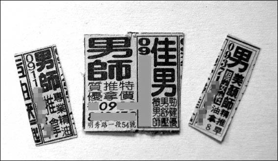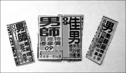 台中警方透露,台湾男人应召案例并不多见,且该类男妓不但接女客,有时也接男同性恋的客人,性关系复杂,容易感染性病,在“人肉市场”中属高危险群,提醒寻芳客注意。(罗煜明)